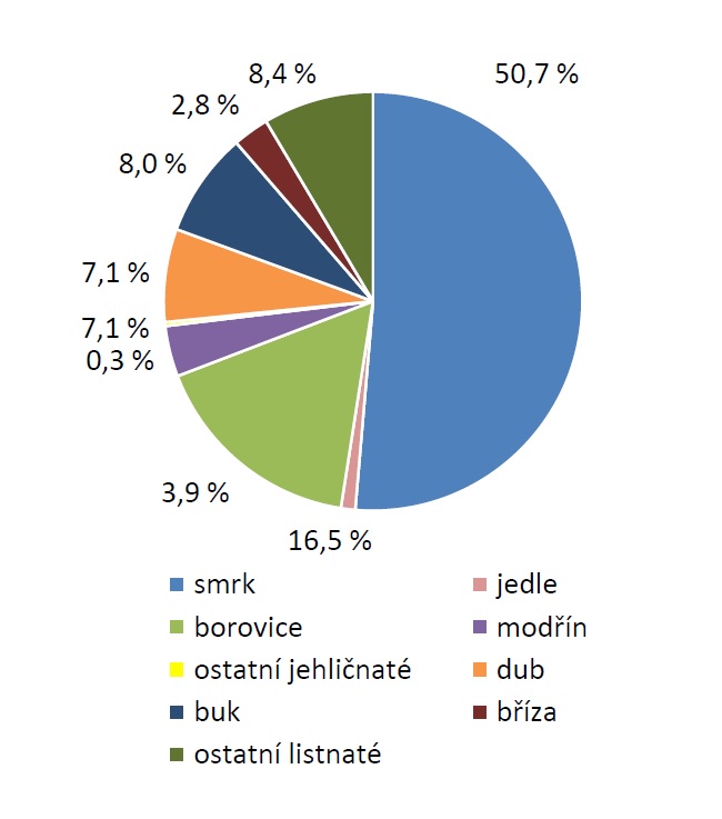 Plocha hlavních jehličnatých dřevin, tj. smrku, borovice a modřínu, se nadále snižuje, zatímco podíl jedle vykazuje setrvale mírný nárůst. Naproti tomu se zvyšuje podíl listnatých dřevin, zejména buku.