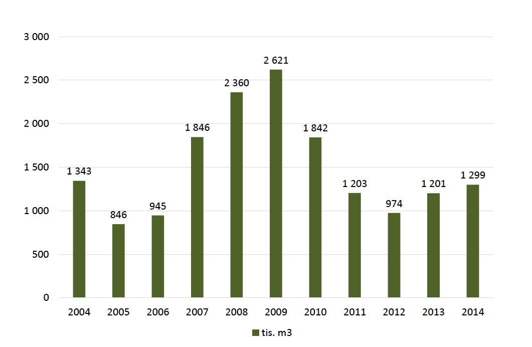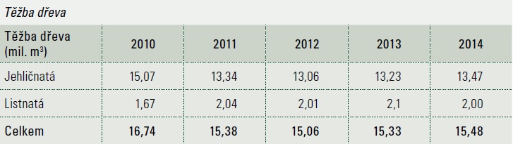 V lesích ČR bylo vytěženo celkem 15,48 mil. m3 surového dříví, což ve srovnání s předchozím rokem znamená nárůst o 0,15 mil. m3. Značnou měrou se na tomto objemu podílelo zpracování nahodilých těžeb (4,5 mil. m3). Podíl nahodilé těžby v roce 2014 činil 29 % a poněkud tak zhoršil podmínky pro plánovité hospodaření v lesích.
