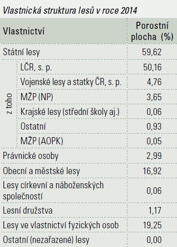 Rok 2014 podobně jako předchozí roky nepřinesl žádné významné změny ve vlastnické struktuře porostní plochy pozemků. Nejvíce plochy zaujímají lesy ve vlastnictví státu obhospodařované zejména LČR, další významný podíl tvoří soukromí vlastníci, obce a města.
